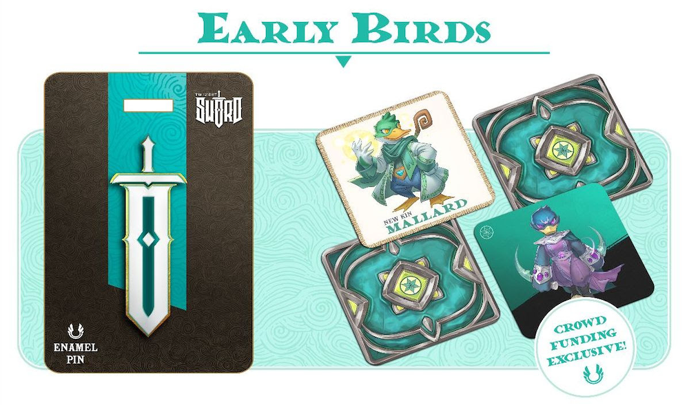 Si vous contribuez au cours des premières 72 heures, vous recevrez deux récompenses exclusives sans frais supplémentaires : un pin’s émaillé de la légendaire Épée du Crépuscule (Twilight Sword), et un ensemble de cartes spéciales qui présentent le peuple Colvert, une race jouable et un type d’ennemi bonus.