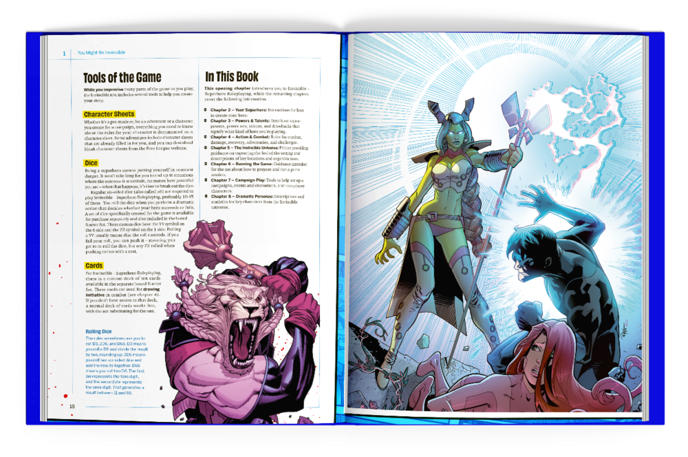 Le late pledge de Invincible – Superhero Roleplaying propose un livre de règles complet — en édition standard et collector — ainsi qu’une boîte d’initiation, le tout illustré par Cory Walker et Ryan Ottley, avec une direction artistique de Johan Nohr (MÖRK BORG).
